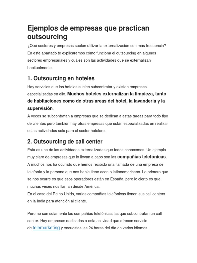 Outsourcing o subcontratacin es una tcnica innovadora de administracin, que consiste en la transferencia a terceros que no forman parte del giro principal del negocio a fin de obtener competitividad y resultados tangibles. La correcta elección del proveedor, es decir, del especialista. Los ejemplos de esta práctica están a la orden del día. Para poner toda esta descripción de una forma más simple aún, podríamos dar el siguiente ejemplo de lo que se. El esquema de contratación de personal conocido como outsourcing y cuál es su base legal. Diga un ejemplo de la vida real de outsourcing. Ejemplos y áreas de aplicación. Numerosas empresas subcontratan servicios de community manager (cm). Los servicios administrativos más subcontratados actualmente, son: Ejemplos de proyectos y planificaciones para externalizar. El outsourcing es un término inglés dónde una empresa de gestión tiene la responsabilidad de realizar las ¿qué hace un outsourcing? El personal de limpieza es otro caso común. El outsourcing es una estrategia mediante la cual un negocio externaliza algunos procesos o servicios, con el propósito de conseguir una mayor eficacia y rentabilidad.